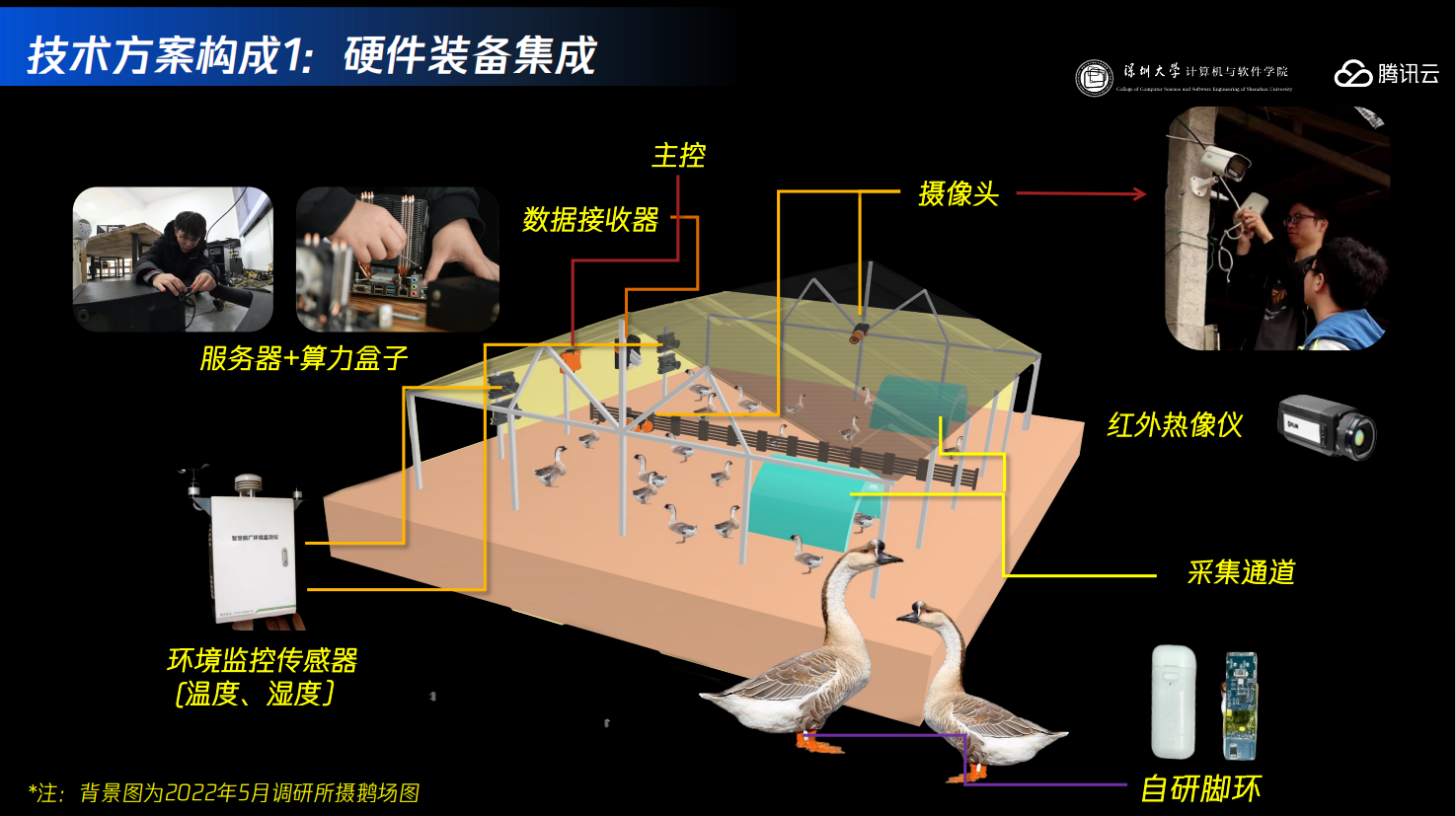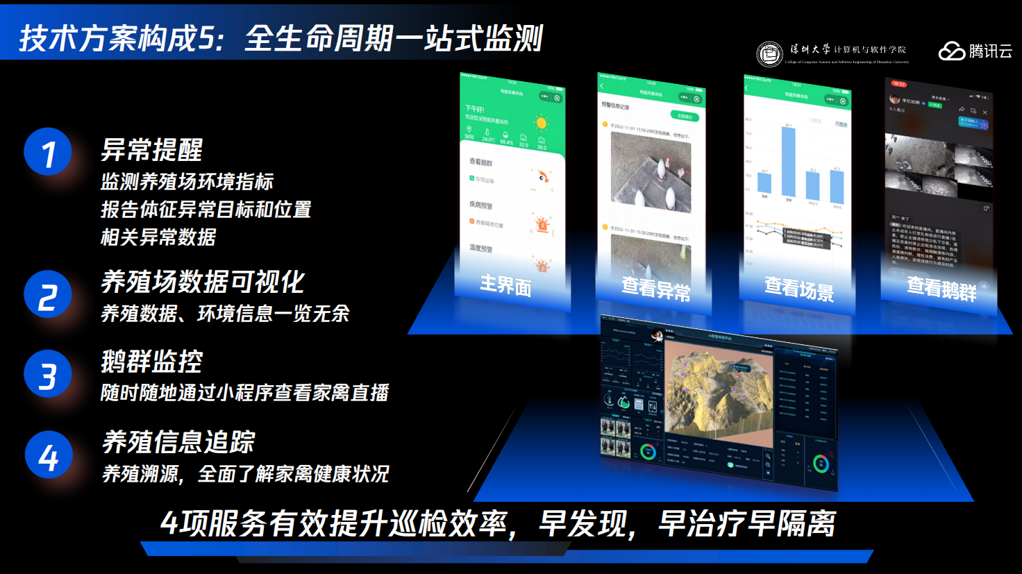 通过摄像头、红外热像仪、主控、数据接收器、服务器+算⼒盒⼦、环境监控传感器(温度、湿度)、采集通道、⾃研脚环等设备,打造一个AI智慧养殖场基地。可以为智慧脚环、入侵监测模块提供通讯功能,实现通讯范围内所有设备信息采集,并且将所有采集到的信息保存至本地,提供基础的数据保障。后端按照信息平台设定内容发送数据,对于部署范围内的每个模块状态监测,都能够上报至信息平台提醒养殖户处理,实现全生命周期一站式监测。